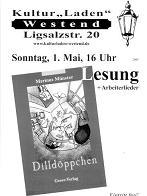 Strahlende Sonne am ersten Mai in München, der dazu noch auf einen Sonntag fiel, da standen die Chancen für die Lesung im kleinen Kulturladen Westend nicht besonders. Auch wegen der Konkurrenz der unzähligen anderen Kulturveranstaltungen in der bayerischen Hauptstadt. Dennoch: Marinus Münster las unterstützt von Klaus Eckardt (Gesang) und Annette Hübel (Klavier) aus seinem Roman Dilldöppchen vor einem Dutzend ZuhörerInnen. Diese Veranstaltung war etwas Besonderes. Nicht nur weil die Erzählung betrieblicher Auseinandersetzungen in einem New-Economy-Unternehmen mit historischen Arbeiterliedern umrahmt wurde. Sondern auch, weil eine Reihe der ZuhörerInnen den wahren Hintergrund der Geschichte kannten, ihn selbst miterlebt hatten und nun als Vorbilder der Romanfiguren mit ihrer Umsetzung in einer sehr subjektiven Erzählung konfrontiert wurden. Jedenfalls hat’s allen Beteiligten gefallen und sie beendeten die kleine Veranstaltung – wie es sich für einen solch schönen ersten Mai gehört – echt-münchnerisch im Biergarten.